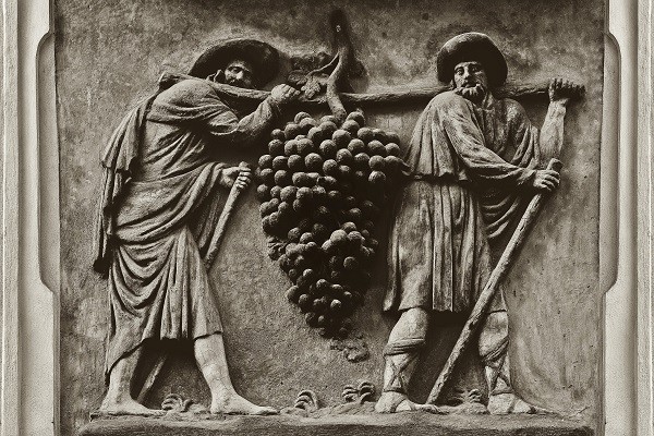 Na tomto místě stály dva menší gotické domky. V průběhu let byly několikrát přestavěny a nakonec spojeny v jeden. Dům U Modrého hroznu (nebo také U Dvou vyzvědačů) získal dnešní podobu v 2. polovině 18. století a tehdy na něj byl umístěn domovní znak, který znázorňuje starozákonní výjev Jozua a Káleba, jak přinášejí obrovský hrozen z Kannanské země. Domů se znamením hroznu bylo v Praze hned deset. Další takový dům U Zeleného hroznu můžeme na naší vycházce potkat u Pražského hradu v ulici Úvoz č. 30.