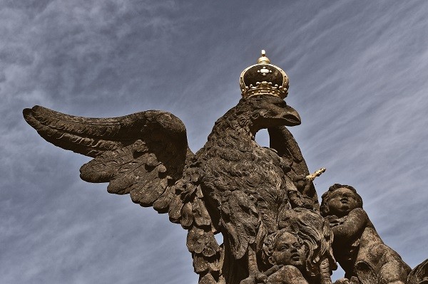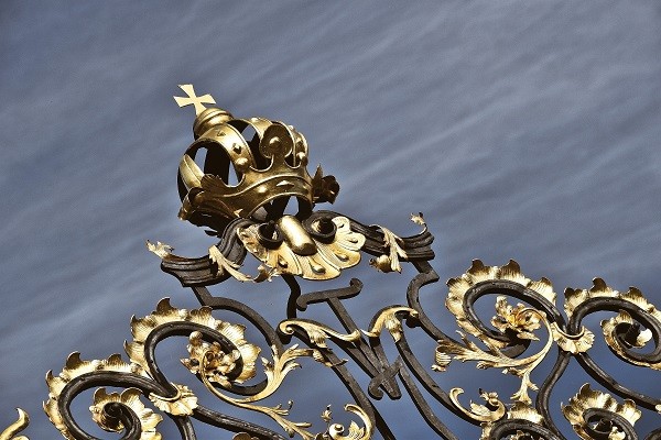 Jsme na konci naší procházky, u západní a také hlavní brány do Pražského hradu. Vítají nás čtyři velké sochy. Dvě jsou zápasící titáni s bronzovým kyjem a dýkou. Jsou doprovázeni symbolem rakouského impéria – orlem s rakouskou korunou a symbolem Českého království – korunovaným lvem s žezlem. Obří plastiky doplňuje bohatě zdobená černo-zlatá rokoková mříž, velkolepé a stylové uvítání příchozích.